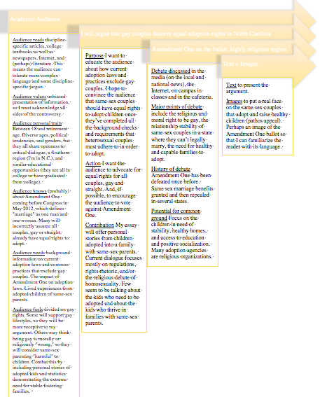 A flowchart.  Each of four sections overlaps, with yellow arrows as the title bars.  From the left, and the top arrow, is Audience, containing "what does your audience read (helpful info for adapting tone and language)? / What are some of the values of the audience? / What personal traits do you know about their age, location, region, political tendency, education, race, gender, and familial status? / What might your audience already know about your topic? / What new and insightful information will you offer them? / How do you anticipate that your audience feels about this topic? / Which points of you argument may prove most contencious for this audience?.  The 2nd box is Purpose: What do you want to convince the audience of? / What do you want the audience to do after taking in your argument? / How will your writing contribute to the current conversation on this topic?.  The third box is "Context": Where is this debate being discussed (in the media, in LGBT studies, in psychology literature, for example)? / What major points frame the debate? / What perspectives dominate the current conversation? Why? / What points of agreement exist within the debate? / Where is there potential for common ground within the debate? / What is the history of this debate (how long has it been going on; what major events have impacted the discussion)?.  The last box is Medium: Is multimodality possible (combining visual, spatial, auditory, and textual elements)? / What genre will be serve your purpose (we're writing an argument per our professor's assignment)? / How will the audience access your writing?