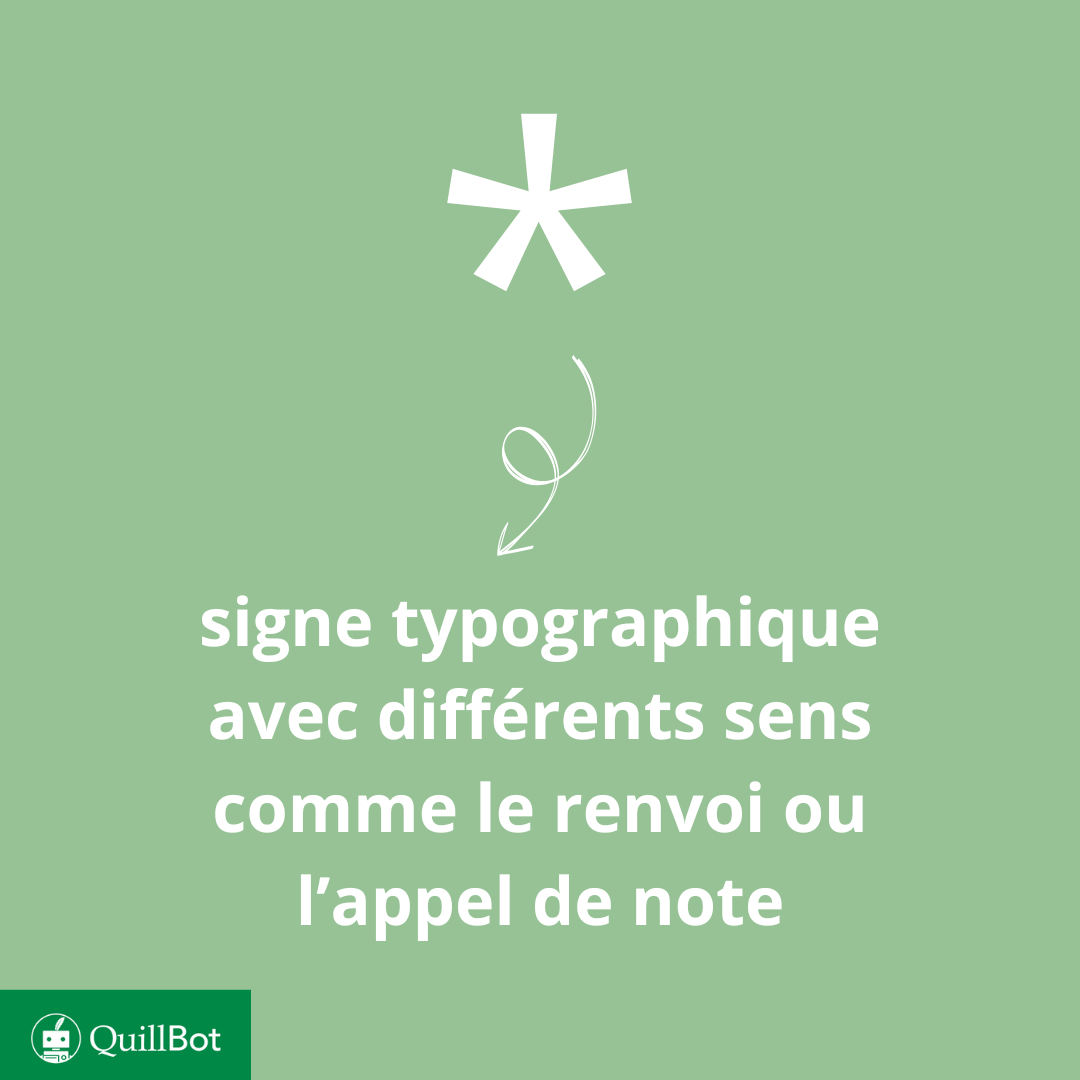 Charrin, A. (21 août 2025). Astérisque | Définition & utilisation. Quillbot. Date : 25 mars 2026, issu de l’article suivant : https://quilbot.jintools.com/fr/blog/typographie/asterisque/